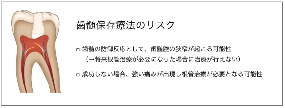 | リスク・副作用 | 歯髄保存療法を行った歯は、歯髄の防御反応として、歯髄腔の狭窄が起こる可能性があります。これは、将来根管治療が必要になった場合に治療が行えないリスクとなります。また、術後に痛みが生じた場合には根管治療が必要となる場合があります。 |
