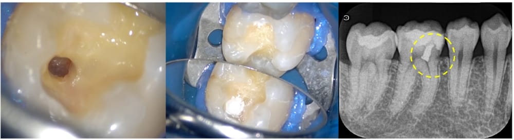 かかりつけ歯科医院にて虫歯を指摘され、深く広がっているため神経を取る根管治療が必要と説明を受けられた患者様です。ご自身で調べたところ、歯髄を残したいと希望し、当院を受診されました。歯髄検査の結果と虫歯の位置や深さなどから、歯髄保存療法の適応と診断し、治療を行いました。