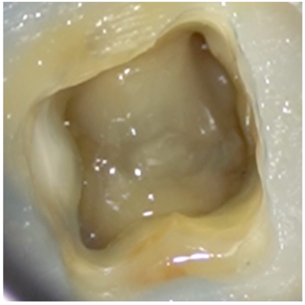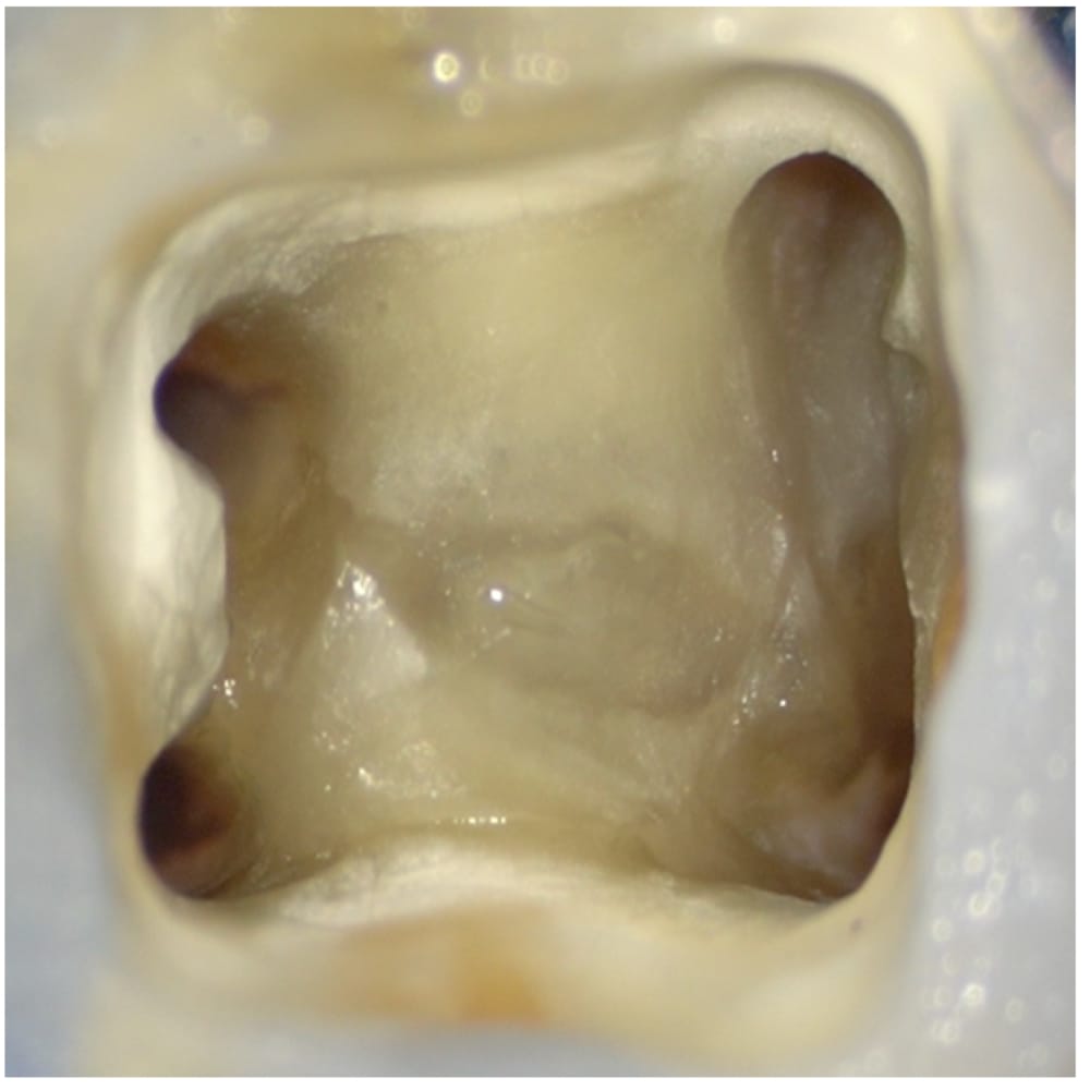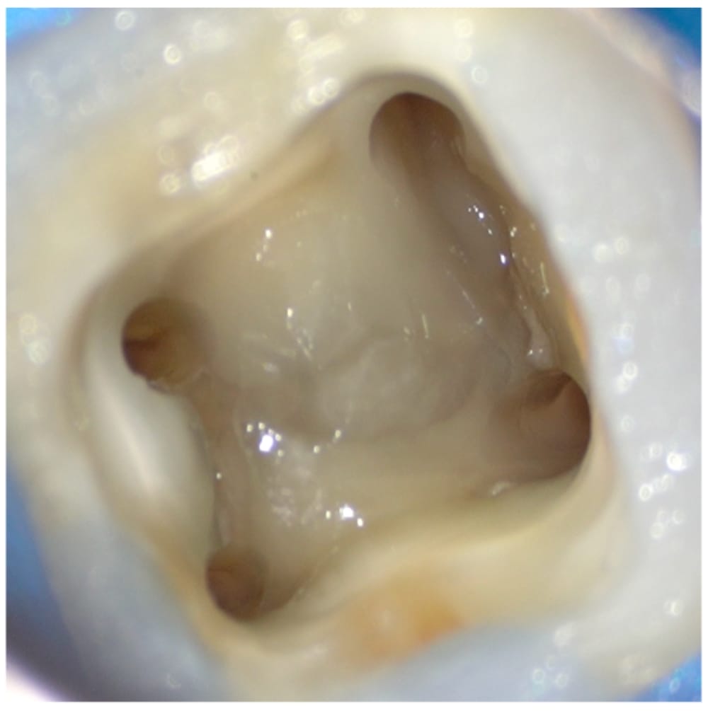 歯茎の腫れと鈍痛を主訴に、かかりつけ歯科医院を受診したところ、神経が死んでおり根管治療が必要だが、特殊な根の形をしていてかなり難しいと説明を受けた患者様です。ご自身で ネットで根管治療について調べ、当院を受診されました。 歯髄は壊死しており、根分岐部を含む根尖周囲組織の歯槽骨の吸収が認められ、歯周ポケットは10mmのエンドペリオ病変と診断しました。 デンタル、CTにて、Radix Entomolarisを認め、Initial Treatmentではあるものの慎重な処置が必要なケースでした。 遠方からの受診であったため、1回で根管充填まで完了しました。 残存歯質を可及的に残すためにもアクセスは小さい方が望ましいとされますが、特に湾曲が強いケースにおいては、治療中の偶発症を防ぎ安全に処置を進めることを最優先し、アクセスキャビティの設定と十分なストレートラインアクセスを行っています。