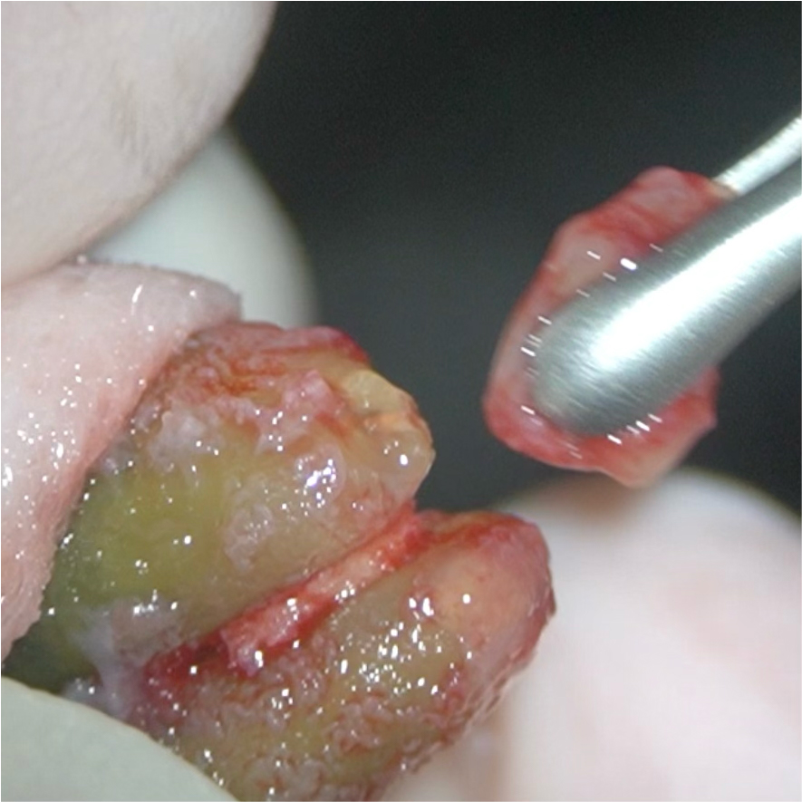 歯に負担がかからないように、ゆっくりと抜歯します。抜歯時に根の先に根尖病変(膿の袋)が形成されており、除去を行いました。抜歯時にできるだけ歯の周囲の歯根膜にダメージを与えないことが重要となります。
