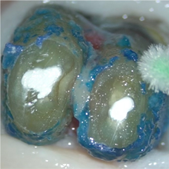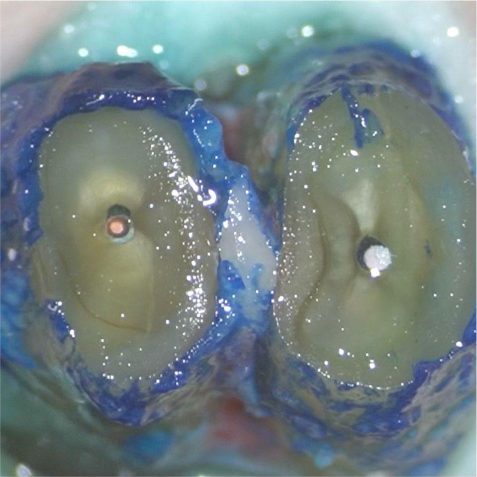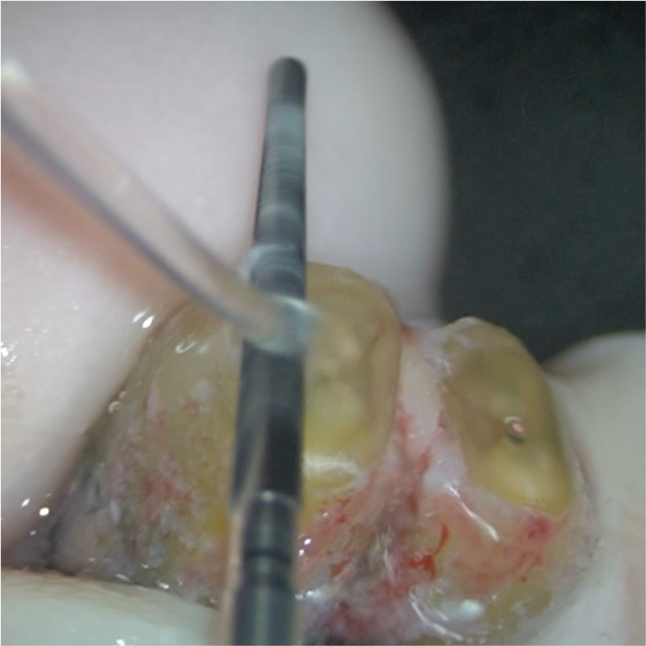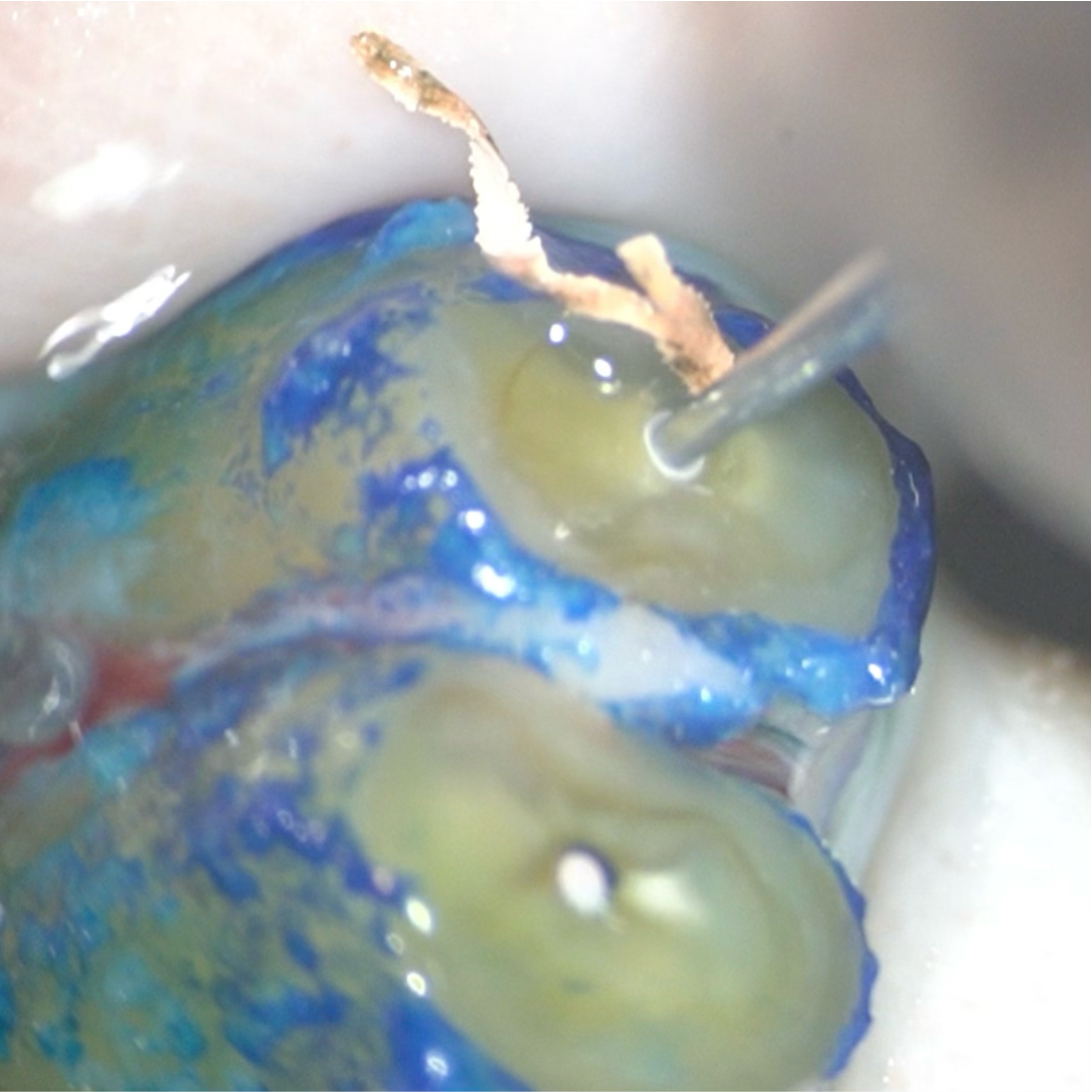 色素で染め出しを行い、クラックの有無や、切断面の根管の形態(複根管やイスムスなど)を精査します。この工程は、裸眼で精査することは難しく、高倍率での顕微鏡下での精査が必要です。ここでもしもわずかなクラックが認められる場合、クラックが消失するまで根尖部分の切除を進めます。
