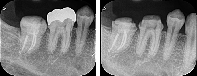 D根(遠心根)のみわずかに黒い影は残っていますが、治る方向へ進んでおり、時間経過とともに完全に治癒すると考えられます。