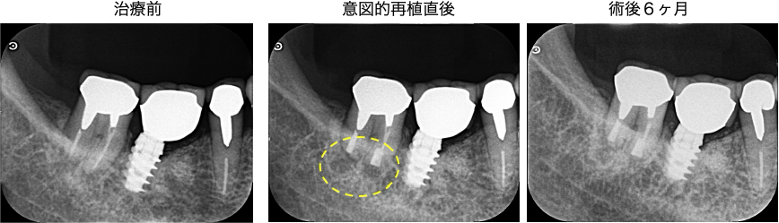意図的再植術は外科的歯内療法のひとつで、一般的には根管治療で治らない場合に行われる処置です。しかし、今回のように状況によっては、初めから意図的再植術を行うことが適応となる場合もあります。幸いにも、抜いた歯を精査したところクラック(歯の破折)がなかったことから、問題なく治療を終えることができました。術後6ヶ月時点で治癒傾向を認め、歯の同様も痛みの症状もなく経過良好です。このままできるだけ長く、健康な歯を維持できることを祈っています。