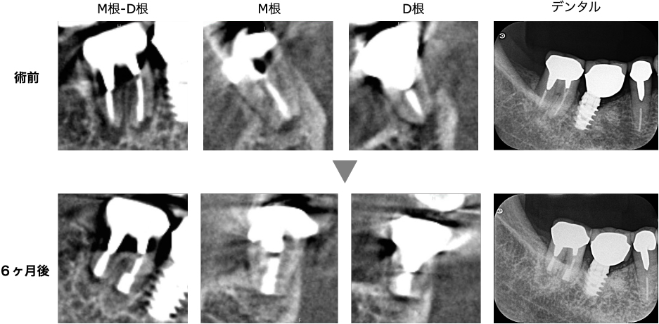 術前と術後のレントゲン・CT画像を比較すると、根の先の黒い影(根尖部の透過像)の縮小傾向を認め、経過良好といえます。