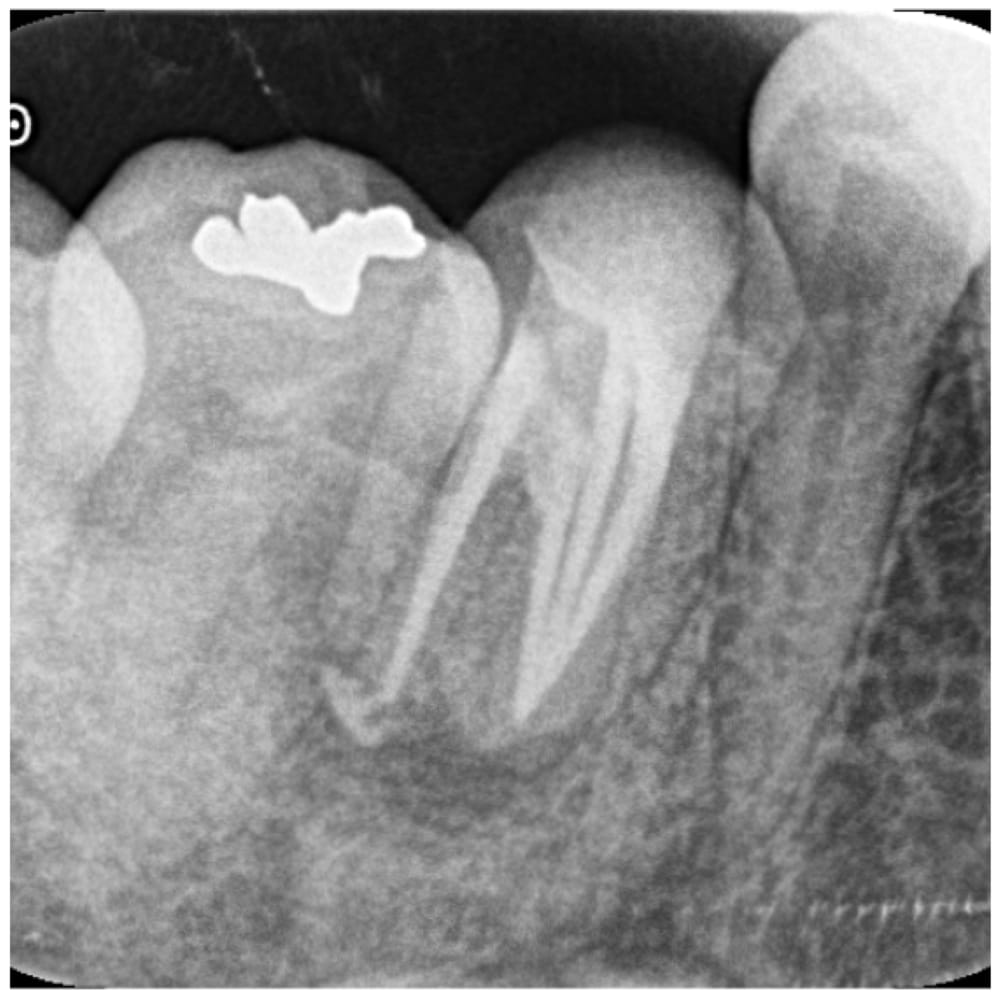 かかりつけの歯科医院からのご紹介患者様です。噛むと鈍痛があり、根の先の骨の吸収が大きく、再根管治療が難しいため抜歯を勧められたとのことでした。なるべくなら抜歯は避けて自分の歯を健康に残したいとのことから、根管治療の専門のクリニックへの紹介を希望し、当院をご紹介いただきました。