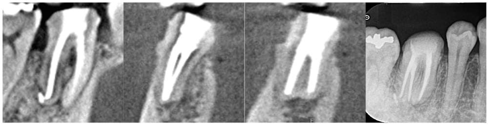 6ヶ月後の経過観察時には初診時の噛んだ時の鈍痛は消失していました。レントゲン、CTにて、根尖部の明瞭な骨の回復が認められ、治療がうまく奏功していることが確認できました。