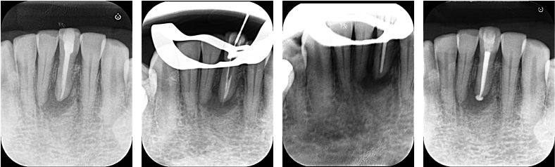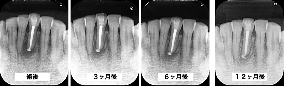 術後、3、6、12ヶ月の経過観察を行いました。6ヶ月時点では根尖部の透過像は残っていましたが、12ヶ月時点で根尖部の骨吸収像は消失し、良好な経過をたどっています。
