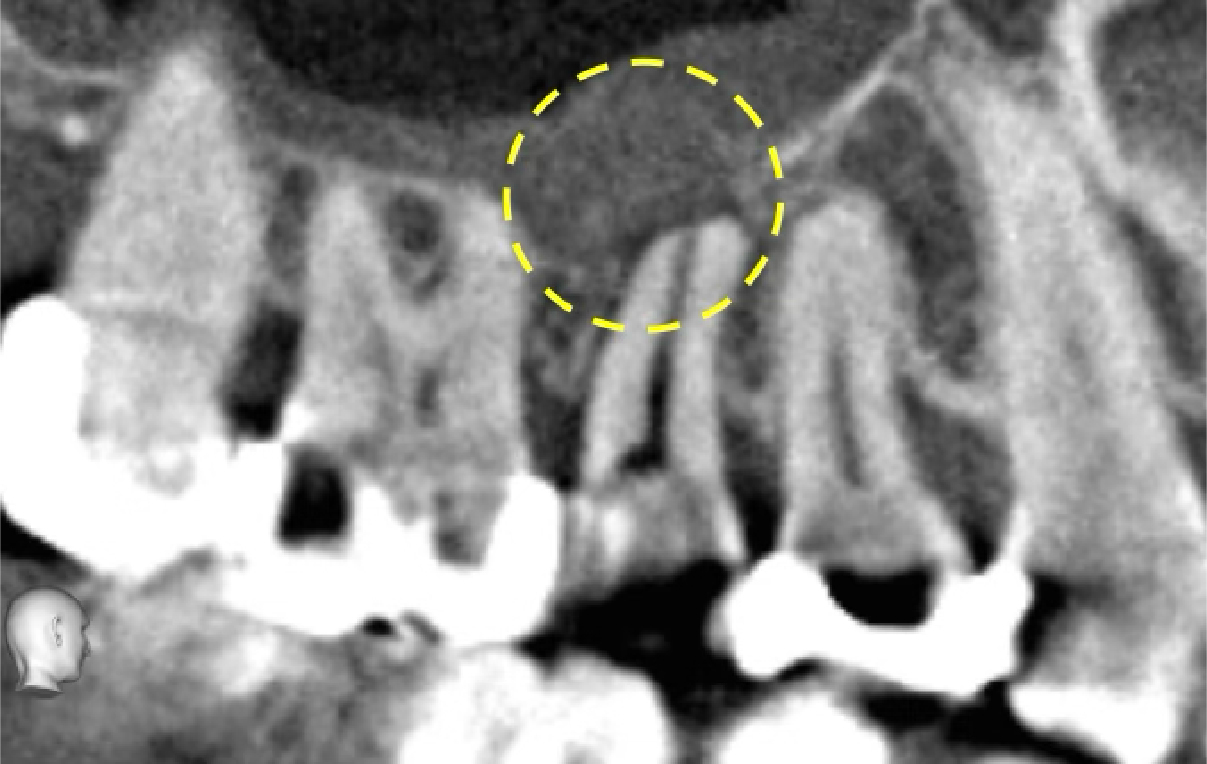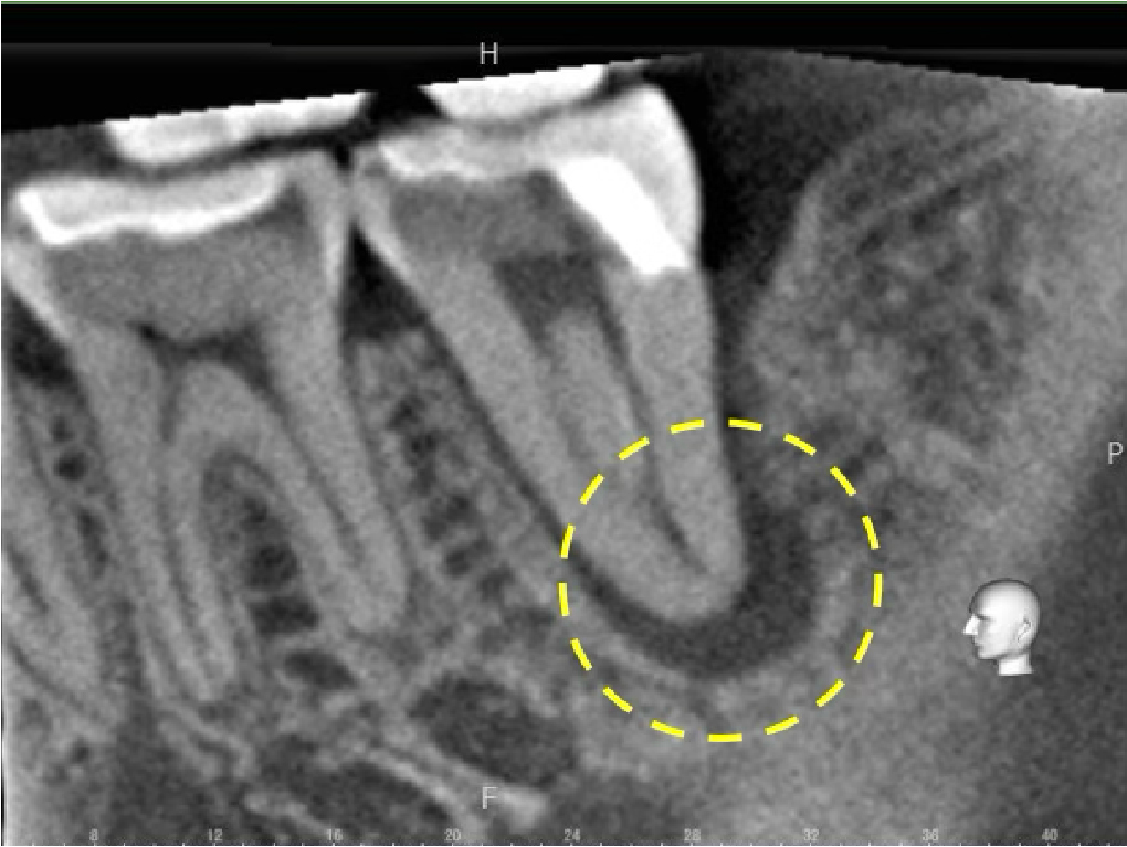 かかりつけの歯科医院にて、根管治療を受けたが根の先の膿が治らないことを理由に紹介された患者様です。根管治療から3ヶ月が経過していましたが、歯茎の腫れが術前と変わらず、痛みもある状態でした。