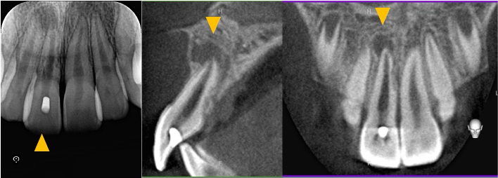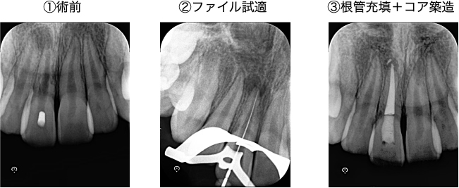 今回のケースでも、根管の外部吸収が認められ、予後にやや不安が残る状態でした。