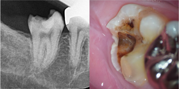 元々入っていた銀歯が脱離し、内部で虫歯が確認できる状態でした。レントゲンでは、歯髄(歯の神経)に近接する深い虫歯が認められ、歯髄検査の結果から、すでに歯髄壊死(神経が死んでいる状態)であると診断できました。