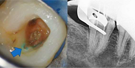 ラバーダムを装着し深い虫歯を除去すると、神経まで達していたことが確認できました。そのまま虫歯を完全除去し、歯の根の長さを測定後、ニッケルチタンファイルを使用して歯の内部の機械的拡大を行い、薬を入れて初回の治療は終了しました。