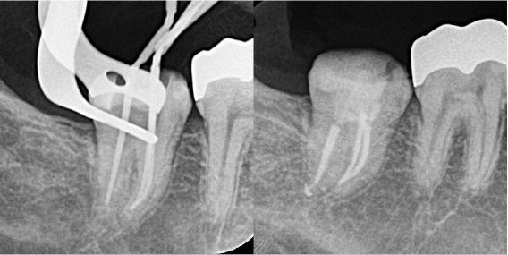 2回目の来院時にはほとんど痛みは消失していました。再度根の中を清掃し、根管充填・コア築造まで行い、治療は完了しました。