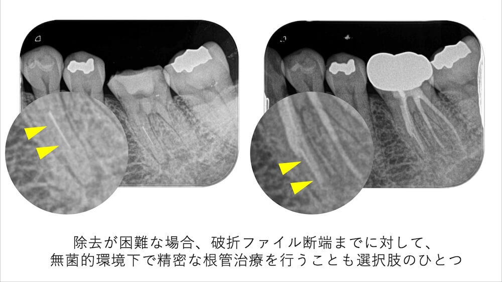 基本的には破折ファイルが除去できなくても、従来通り無菌的な根管治療を行い、治癒するかどうか6〜12ヶ月程度経過観察を続けます。その後、治癒すれば破折ファイルが残っていても問題ありません。