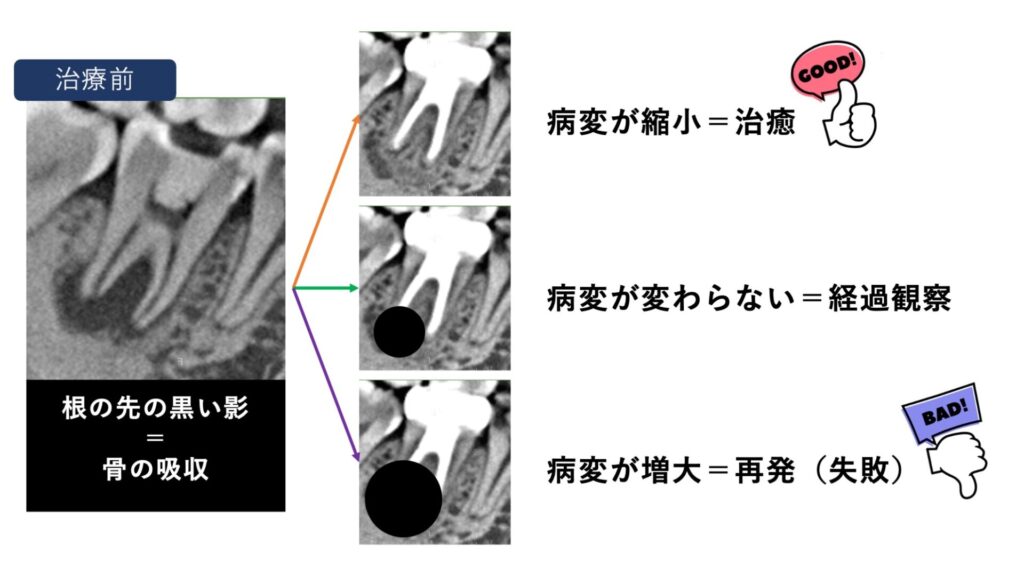 歯根端切除術をしても治らない場合は、さらに歯根を短く切除する再外科治療か、残念ながら抜歯が選択肢となります。術後の痛みや腫れなどの症状は、治療の成否の判断には影響しません。そのため、術後6〜12ヶ月程度の経過観察が必要となります。