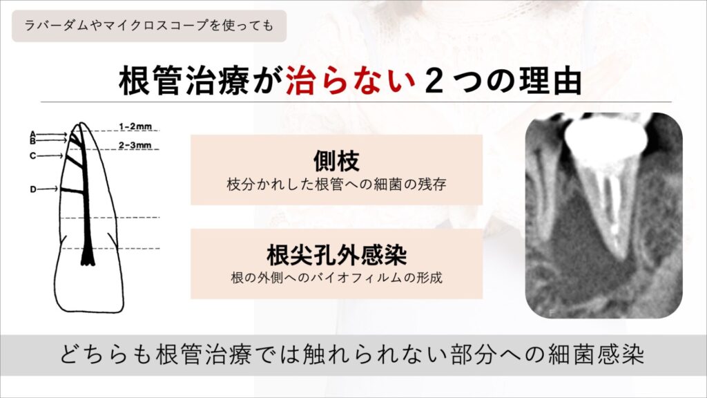 上記2つは、どちらも根管内の清掃だけではアプローチすることが不可能であり、根管治療で治らない原因になるといえます。