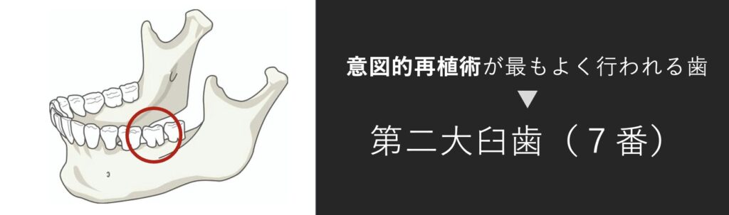 下顎大臼歯、特に最後方臼歯である第二大臼歯(7番)が、最も意図的再植術が行われることが多い歯といえます。第二大臼歯は、物理的に奥の方に位置しており、歯根端切除術を行うための術野の確保や、正確な器具操作が困難であることがその理由です。
