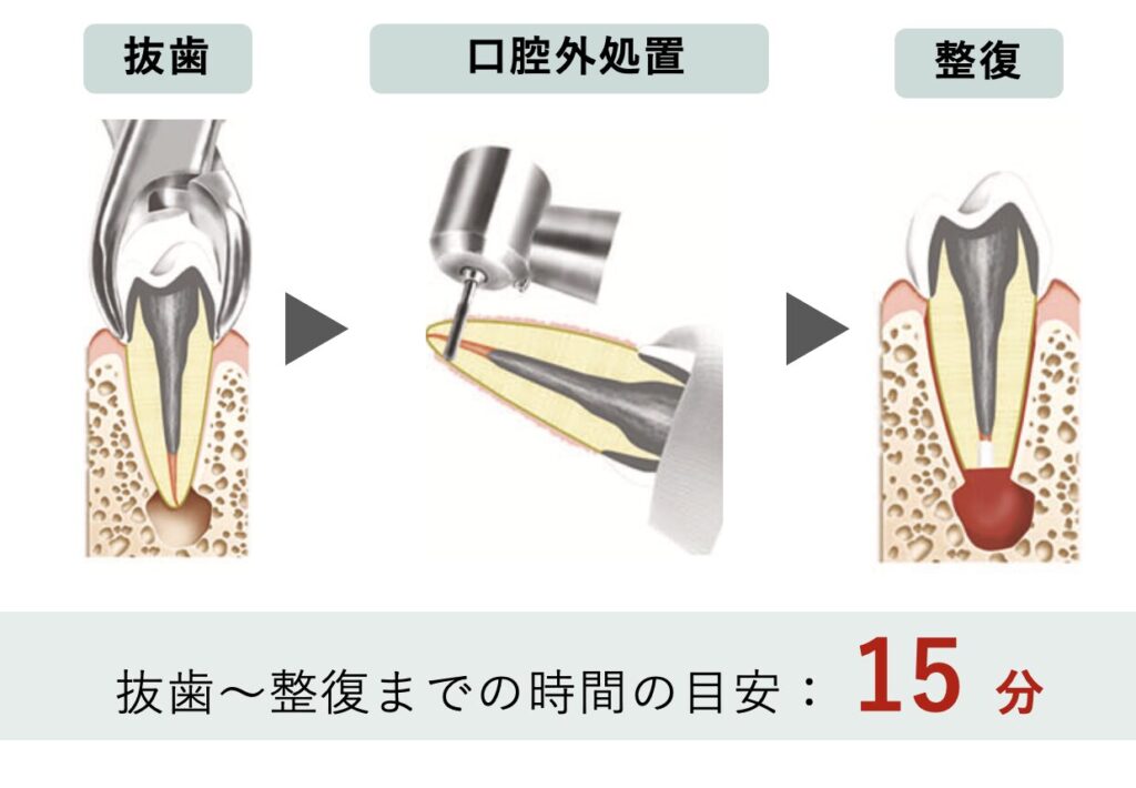 抜歯した歯の根尖部を切除、逆根管形成、MTAセメントによる逆根管充填を行い、速やかに元の位置へ戻します。