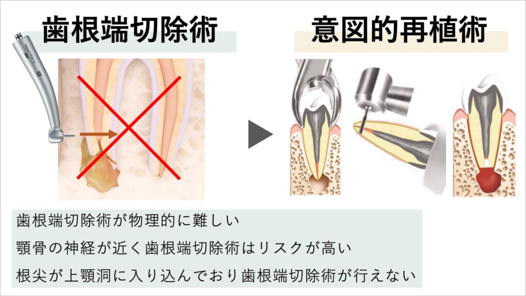 意図的再植術は、特定の条件下で選択される特殊な治療法です。基本的には、外科的歯内療法を考える際には、歯根端切除術が第一選択となります。しかし、さまざまな理由から歯根端切除術が難しい場合、意図的再植術が行われます。
