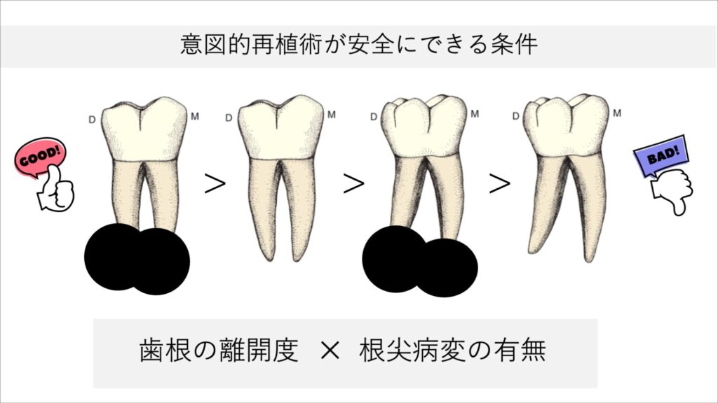 意図的再植術は、歯根膜を傷つけることなく抜歯ができるかどうかが、予後を大きく左右します。抜歯がスムーズに行えるためには、「歯根の離開度」と「根尖病変の有無」が影響します。