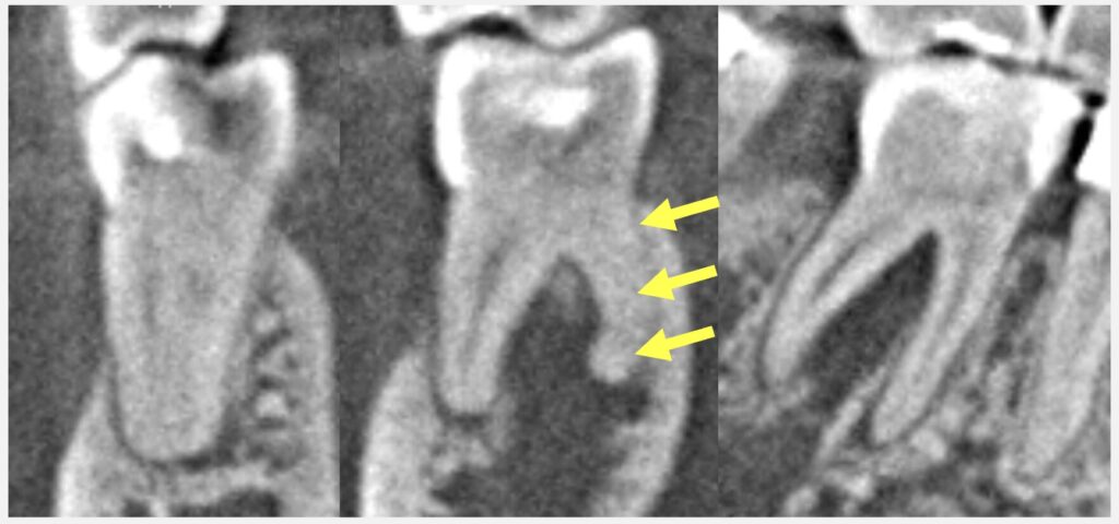 今回一番問題となるのが、歯の根が強く曲がっていて、根管も狭窄して細くなっている点です。非常に珍しいというわけではありませんが、慎重に治療を進めないと、ファイル破折という治療器具が根の中で折れる可能性があります。
