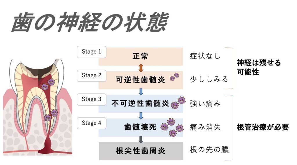 お疲れ様でした。拝見したところ、まず歯の神経は完全に死んでしまっている歯髄壊死という状態です。