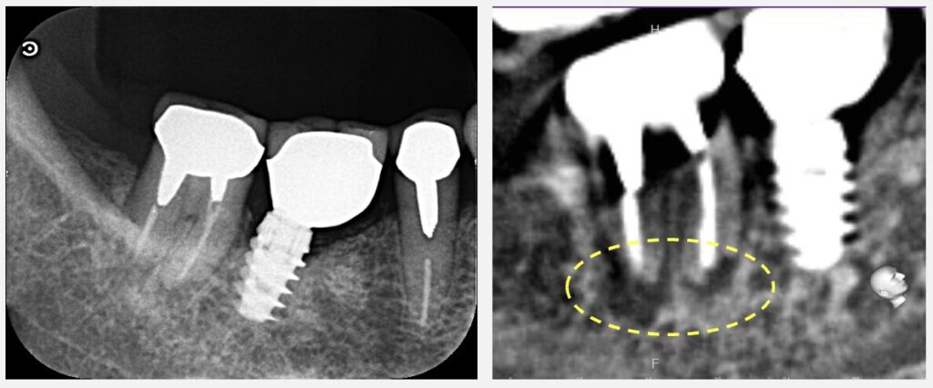 右下奥歯が噛むと痛いという症状のため、近医を受診したところ、意図的再植術が必要と言われた患者様です。通常の根管治療ではなく、意図的再植術という特殊な治療であるため、かかりつけの歯科医院ではあまり治療の経験がないと言われ、ご自身で調べて来院されました。「歯を抜いて、根の先を切ってMTAセメントをつめ、元に戻す」ということは調べたものの、「本当に歯を抜いて戻す治療は大丈夫なのか」と不安になり、専門医に話を聞きたいと考えるようになったとのことです。