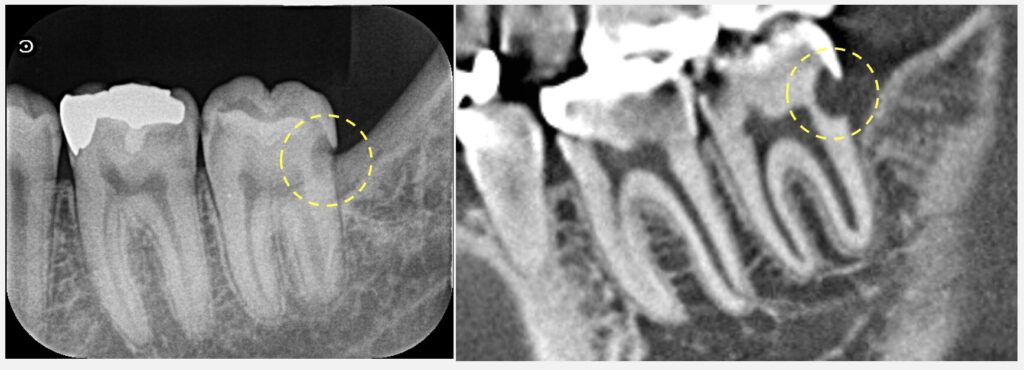 来院される数ヶ月前から、歯がしみる感じが続いており、かかりつけ歯科医院を受診された患者様です。虫歯が深く神経を取る治療が必要と説明を受けたものの、これまで神経を取る治療を受けたことがなく、調べる中で歯の神経を残す治療(歯髄保存療法)というものがあると知り、当院を受診されました。