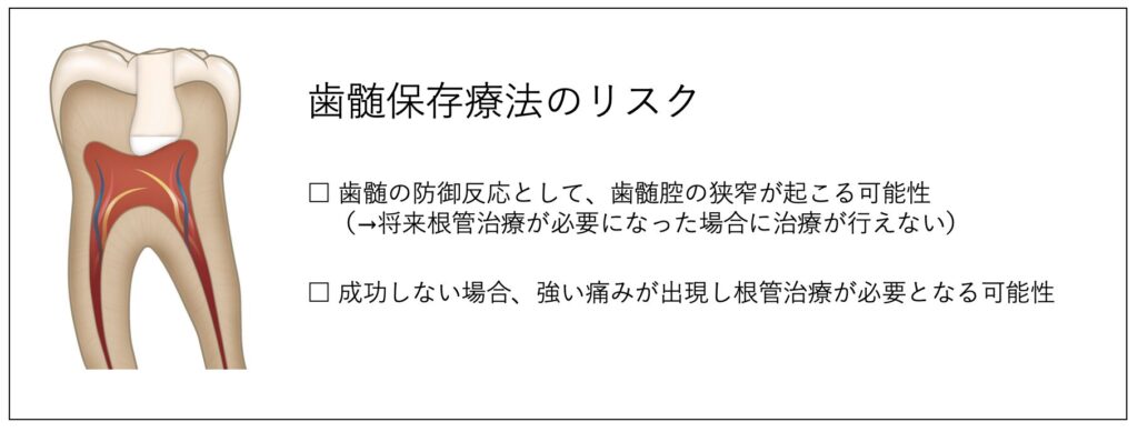 まず、治療がうまくいかない場合、術後に強い痛みが生じる可能性があります。歯の神経の炎症がうまくコントロールできないと、徐々に神経が壊死する方向に進みます。また、歯髄保存療法はうまくいってもいかなくても、「歯髄の狭窄」という問題が起こります。これは、歯の神経が刺激に対して防御反応を起こし、神経の道筋が狭く狭窄することを指します。もしも歯髄保存療法がうまくいっていれば直接の問題はありませんが、仮に根管治療が必要となった場合、神経の道筋が狭くなりすぎると根管治療を行うことが不可能となり、最悪の場合は抜歯しか選択肢がなくなるという事態にもなりかねません。