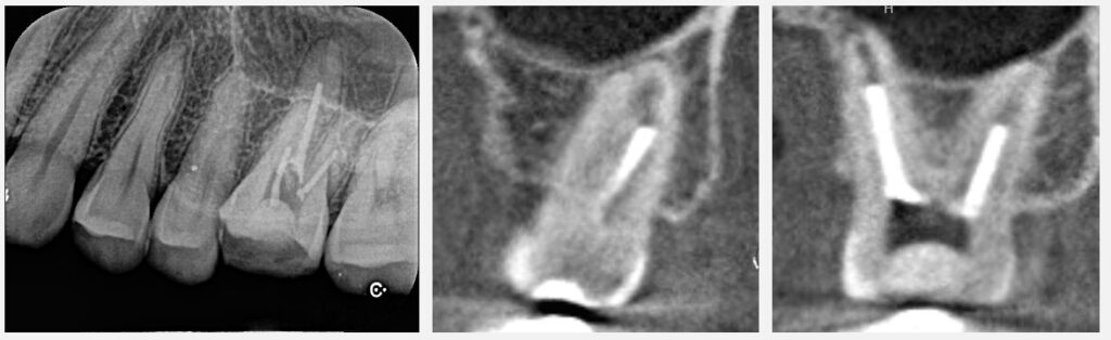 左上第一大臼歯の根管治療を2ヶ月ほど受けられていた患者様です。痛みがずっと継続していたものの徐々に軽減したため、根管治療の最後の工程である根管充填まで進めました。しかし、その後すぐに痛みが強くなったため相談したところ、「まだ根の中に菌が残っているのかもしれない」「もう一度根管治療をやり直した方がよい」と言われ、治療方針に対して不安が生じ当院を受診されました。